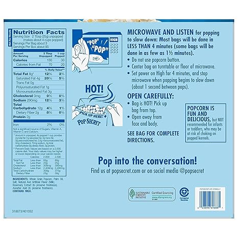Pop-Secret Kettle Corn Microwave Popcorn - 3 CT Allergy and Ingredient ... Pop-Secret Kettle Corn Microwave Popcorn - 3 CT Sweet & salty popcornNon-GMO corn, 100% whole grain0g trans fat per serving, UPC Code 023896498607 Manufactured by Diamond Foods, Inc. ... Nutrition Label. Nutrition Facts. Serving Size 3.00 tbsp un... Amount Per Serving. ... Pop Secret Popcorn, Premium,... View Product . Pop Secret Homestyle ... How many carbs are in Pop-Secret Microwave Popcorn - Butter Popcorn Containing 180 calories (0 kilojoules), 1 serving has the same amt of calories as 45.0 oz pumpkin flowers, 15.0 oz kelp seaweed, and 1.02 cups of lima beans (raw). Overall Score Modest