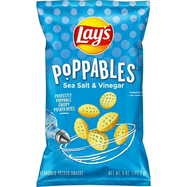 Lay's Poppables Potato Snacks Sea Salt & Vinegar Yum. Airy. Bite-sized. Facebook. Twitter. Find us on Lays.com. Smartlabel: Scan for more food information. 1-800-352-4477 Call for more food information. Questions or Comments? 1-800-352-4477. Weekdays 9:00 am to 4:30 pm CST, email or chat at fritolay.com. Guarantee fresh until printed date or this snack's on us. Manufacturer . Frito-Lay Inc ... LAY'S® Poppables™ LAY'S® Poppables™ are the perfectly popped potato snack that makes you go, LAY'S® Poppables™ are the perfectly popped potato snack that makes you go, "Mmmmmm." It might be the light and airy texture or the flavor inside and out...regardless, these potato puffs are pretty perfect. Available in Sea Salt, White Cheddar and Honey BBQ.