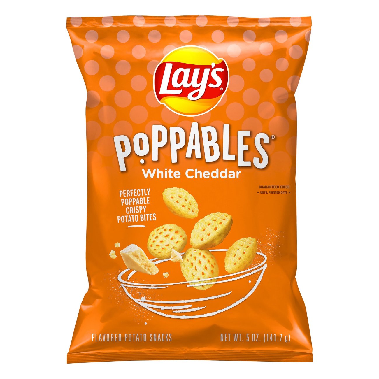Calories in Lay's Poppables and Nutrition Facts Nutritional Summary: Cals 260 Fat 15g Carbs 30g Prot 2g There are 260 calories in 1 portion (50 g) of Lay's Poppables. Calorie Breakdown: 51% fat, 46% carbs, 3% prot. Lay's Poppables White Cheddar Flavored Potato Snacks, 5 oz Bag ... Lay's Poppables White Cheddar Flavored Potato Snacks, 5 oz Bag. Pack Size: Single. Pack Size Single $2.98 59.6 ¢/oz. Pickup, today at Sacramento Supercenter. Aisle A25. ... Calories per gram: Fat 9 • Carbohydrate 4 • Protein 4 . Product details. Perfectly popped, perfectly seasoned with tasty white cheddar on the inside and out, these ... Lay's Poppables Potato Snacks Sea Salt Lay's Poppables Potato Snacks Sea Salt 5 oz bag Nutrition 150 Calories 1g Sat Fat 200mg Sodium 0g Sugars Nutrition Facts Serving Size 30.0 pieces Servings Per Container 5 Amount Per Serving Calories 150 % Daily Value* Total Fat