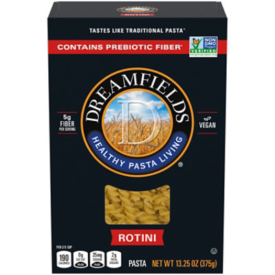 Dreamfields Spaghetti Pasta, 13.25 oz - Fred Meyer Dreamfields Spaghetti Pasta; Hover to Zoom. Hover to Zoom. Hover to Zoom. Item 1 of 3 is selected. Dreamfields Spaghetti Pasta. 13.25 oz UPC: 0076738703404. Purchase Options. ... Nutrition Facts. servings per container. Serving size 2oz (56 g) Amount per serving. Calories 190 % Daily value* Total Fat 1g 1.28%. Saturated Fat 0g 0%. Trans Fat 0g. Home - Dreamfields Foods Rotini. Elbows. Angel Hair. Spaghetti. Linguine. Lasagna. Eat Healthy and Enjoy Pasta. We want to support your healthy eating plans by helping you eat what you love. Dreamfields is a good source of fiber with 5g in every 2 oz. dry serving, making it a satisfying foundation for wholesome meals you'll enjoy.