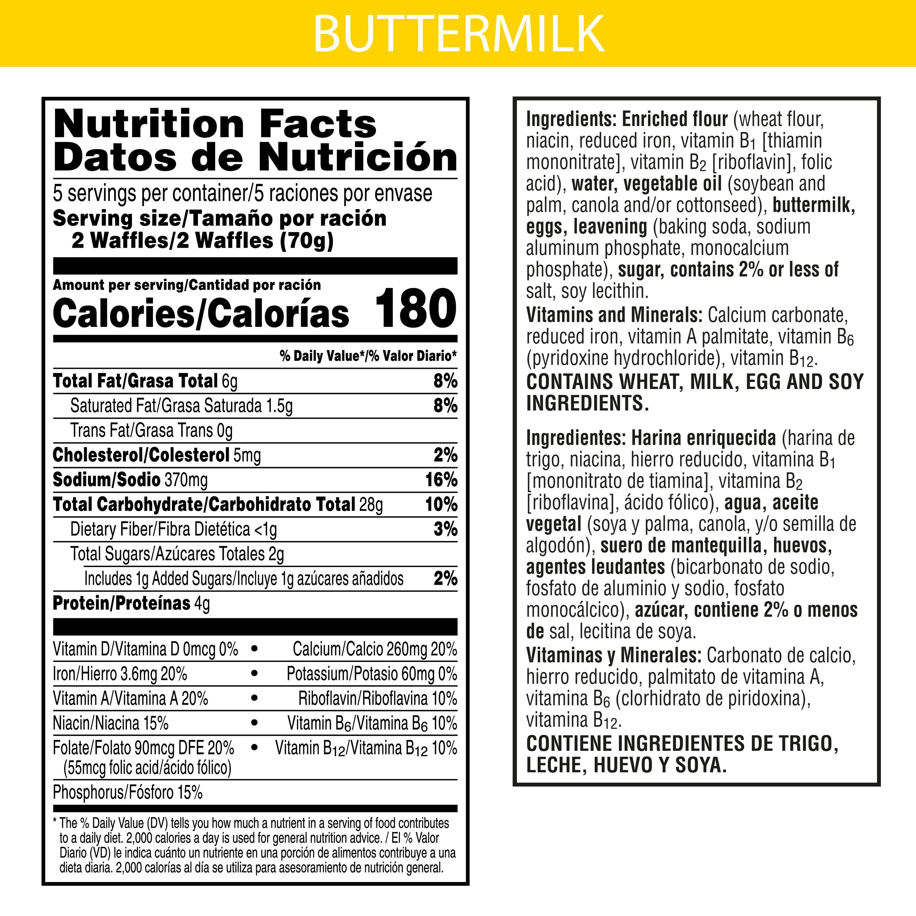 Kellogg's® Eggo® Buttermilk Waffles Details Nutrition Facts & Ingredients Where To Buy Highlights Rise and shine with this classic buttermilk favorite. Delicious Eggo® Buttermilk Waffles taste like home. With a light crispy texture, Eggo® Buttermilk Waffles pair perfectly with syrup, jams, or fresh fruit. They are, as always, a delicious start to your day. Check out LeggoMyEggo.com