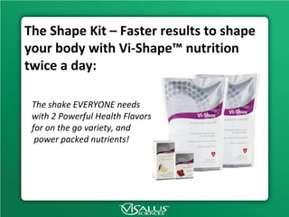 Visalus Body by Vi Shape Kit What are the primary benefits of the Vi-Shape® shake mix? The shake mix provides complete nutrition - fast. A shake can be made and blended in under a minute! Helps control appetite. Provides bone-healthy calcium. Provides heart healthy, low fat protein. Helps promote & maintain lean muscle mass. Supports protein digestion and nutrient absorption.