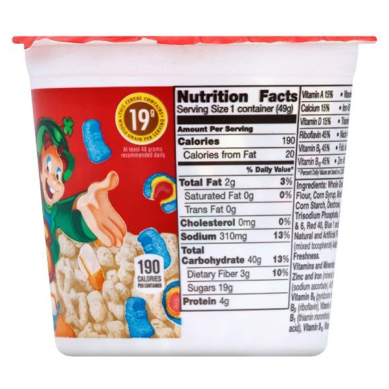 Nutrition Label - University of North Dakota ingredients: lucky charms cereal (whole oat flour (includes oat bran), marshmallow bits (sugar, modified corn starch, corn syrup, dextrose, gelatin, artificial flavor), sugar, corn syrup, corn starch, salt, calcium carbonate, color added, trisodium phosphate, zinc and iron, vitamin c, a b vitamin (niacinamide), artificial flavor, vitamin b6, … Lucky Charms Nutrition Label - This Nutrition 08.01.2021 · Learn more information about lucky charms nutrition label. In this article we'll discuss lucky charms nutrition label. This is not entire article. It continues ... KEEP READING... Related Articles. Nutritional Supplements To Help Lose Weight (Part I) Dr. Emilia Doncheva: In Metabolic Syndrome, Nutrition Is Balanced, Not Scarce ; 6 Rules For Nutrition Against … Lucky Charms Cereal nutrition, glycemic index, calories, net carbs & more Important nutritional characteristics for Lucky Charms Cereal Calories 380 Net Carbs ⓘ Net Carbs = Total Carbohydrates - Fiber - Sugar Alcohols 75.89 grams Acidity (Based on PRAL) ⓘ PRAL (Potential renal acid load) is calculated using a formula. On the PRAL scale the higher the positive value, the more is the acidifying effect on the body. Lucky Charms Instant Oatmeal | Lucky Charms Vitamins and Minerals: Calcium Carbonate, Iron and Zinc (mineral nutrients), A B Vitamin (niacinamide), Vitamin B6 (pyridoxine hydrochloride), Vitamin B2 (riboflavin), A B Vitamin (folic acid). Does Not Contain Obligatory …
