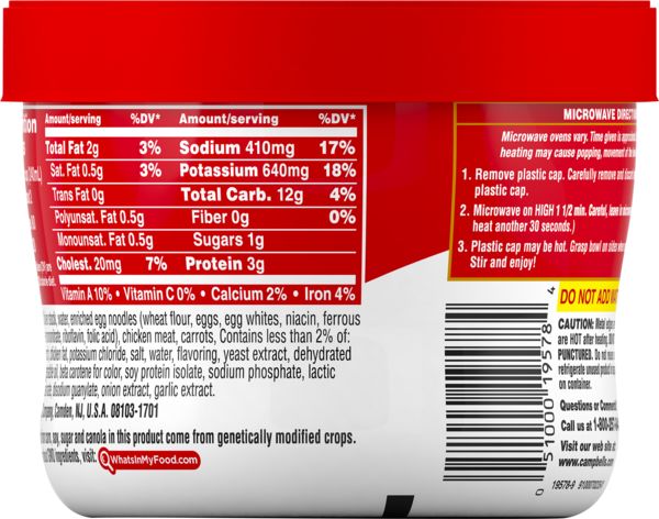 Campbell's chicken noodle soup ingredients label. Campbell's® C hunky® | Campbells.com - Campbell Soup Company WebDoes Campbell’s® label the top eight allergens (peanuts, tree nuts, dairy, eggs, fish, wheat, soy and shellfish)? We follow all government regulations regarding product labeling. When any of these top eight allergens is present in any quantity, it will always be listed in our product ingredient statement. Healthy Request® Soups - Campbell Soup Company WebChicken Noodle Soup Tomato Soup Savory Chicken with Brown Rice Soup Sirloin Burger with Country Vegetable Beef Soup Roasted Chicken Soup with Country Vegetables New England Clam Chowder Show More See all Healthy Request® Soups A Healthy Heart Is a Happy Heart. Each serving is low in fat and cholesterol. Healthy Request® soups are … Campbell’s Cream Of Mushroom Soup Recipes With Chicken Web31.10.2021 · Just cut the sauce ingredients in half, use just as much chicken as you need , and prepare the dinner in an 8-inch square baking dish. Adjust the total baking time depending on the size and type of chicken that you’re using. Whole cut-up chicken pieces with the bone-in will require about 1 hour, while boneless, skinless chicken breast only … Ramen Chicken Noodle Soup - Allrecipes Web04.06.2016 · 3 ½ cups Swanson® Chicken Broth or Swanson® Natural Goodness® Chicken Broth or Swanson® Certified Organic Chicken Broth. 1 teaspoon soy sauce. 1 teaspoon ground ginger. 1 dash black pepper. 1 medium carrot, sliced diagonally. 1 stalk celery, sliced diagonally. ½ red bell pepper, cut into 2-inch-long strips. 2 green onions, …