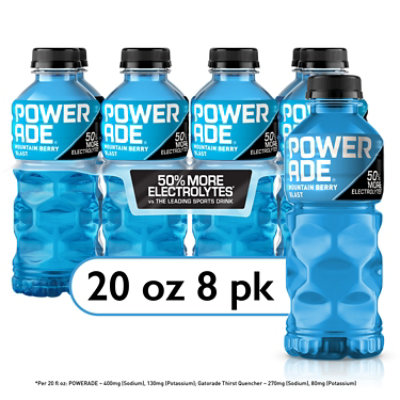POWERADE® MOUNTAIN BERRY BLAST - SPORTS DRINK Nutrition Facts ; Potassium 40mg · 0% ; Vitamin C · 0mg · 0% ; Niacin 3mg · 20% ; Vitamin B6 0.3mg · 20% ; Vitamin B12 0.9mcg · 35% ...