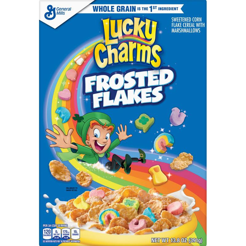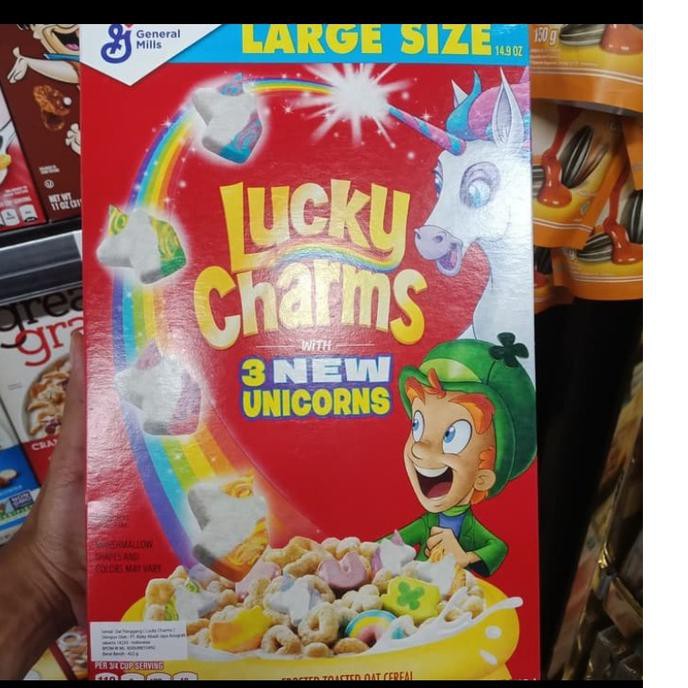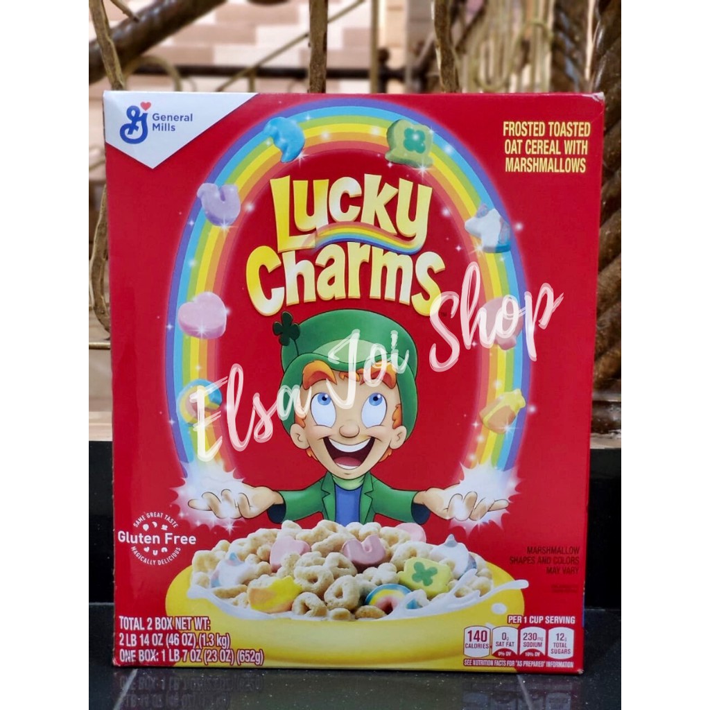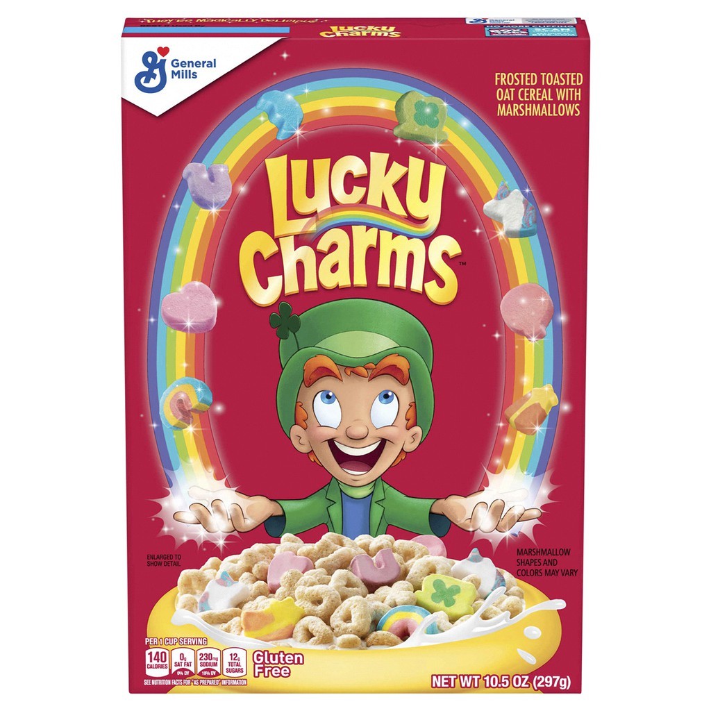 General Mills Lucky Charms Cereal Allergy and Ingredient Information General Mills Lucky Charms Cereal Frosted toasted oat cereal with marshmallowsWhole grain first ingredientThey're magically delicious, UPC Code 016000483637 Manufactured by General Mills, Inc. ... Nutrition Label. Nutrition Facts. Serving Size 0.75 cup. Servings Per Container . Amount Per Serving. Calories 110 Calories from Fat 10 % Daily Value ... General Mills Lucky Charms Cereal 44 Ounce Value Bulk Box Cereal Lucky Charms are my own private revenge for a childhood deprived of sugary name brand cereals. As far as nutrition it's not the best but it's not the worst either - each cup has around 140 calories and provides 14% of your daily calcium and Vitamin C requirements, plus it has almost 40% of the iron you need!