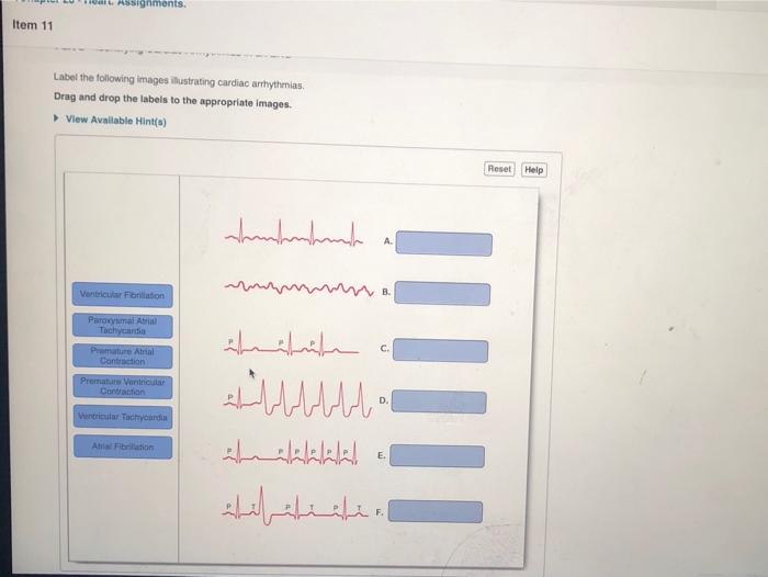 Label the following images illustrating cardiac arrhythmias. Solved Label the following images illustrating cardiad ... Question: Label the following images illustrating cardiad arrhythmias. Drag and drop the labels to the appropriate images. View Available Hint (s) Reset Help A. B. Ventricular Tachycardia Premature Atrial Contraction شاعماو Ventricular Fibrillation Atrial Fibrillation D. Paroxysmal Atrial Tachycardia Premature Ventricular Contraction E. اعتر الت F. Cardiac Arrhythmias-Definitions & ECG Pictures - Quizlet Cardiology Cardiac Arrhythmias-Definitions & ECG Pictures Flashcards Learn Test Match Flashcards Learn Test Match Created by Mrs_KHenry Terms in this set (17) Normal Sinus Rhythm Bradycardia Tachycardia Premature Atrial Contractions Atrial Fibrillation Premature Ventricular Contractions Ventricular Tachycardia Ventricular Fibrillation Heart Block Solved Item 11 Part D- Identifying Cardiac Arhythmias in an ... Transcribed image text: Item 11 Part D- Identifying Cardiac Arhythmias in an EKG Label the following images illustrating cardiac artiythmias Drag and drop the labels to the appropriate Imagen. ) View Availabin Hint (o) Reset Help shamhnhanh B, Voiculochy C. ماشین الرالرلر ااااا Parcury E F F Assignments.