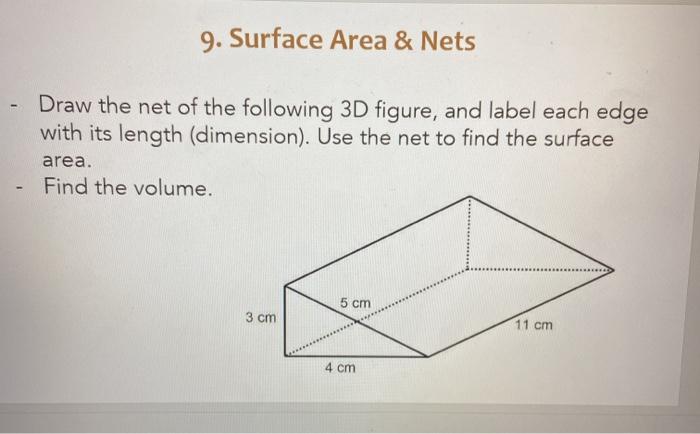 Derivation of the surface area of a cylinder - Math Open Ref The surface area of a cylinder can be found by breaking it down into three parts: The two circles that make up the ends of the cylinder. The side of the cylinder, which when "unrolled" is a rectangle. In the figure above, drag the orange dot to the left as far as it will go. You can see that the cylinder is made up of two circular disks and a ... What is the surface area of this rectangular prism? | Chegg.com Math. Geometry. Geometry questions and answers. What is the surface area of this rectangular prism? Round your answer to the nearest tenth. label required. Surface area using a net: rectangular prism - Khan Academy It follows from the Pythagorean theorem that the leg common to both right triangles (the altitude of the equilateral triangle) is s*sqrt (3)/2. So the equilateral triangle's area is (1/2)s*s*sqrt (3)/2 = s^2*sqrt (3)/4. So the area of a hexagon with side length s is 6s^2*sqrt (3)/4 = 3s^2*sqrt (3)/2. 3 comments ( 13 votes) Upvote Downvote Flag more 5.2: Nets and Surface Area - Mathematics LibreTexts Exercise 5.2. 2: Using Nets to Find Surface Area. Name the polyhedron that each net would form when assembled. Figure 5.2. 3: Three nets on a grid, labeled A, B, and C. Net A is composed of two rectangles that are 5 units tall by 6 units wide, two that are 5 units high and one unit wide, and two that are one unit high and six units wide.