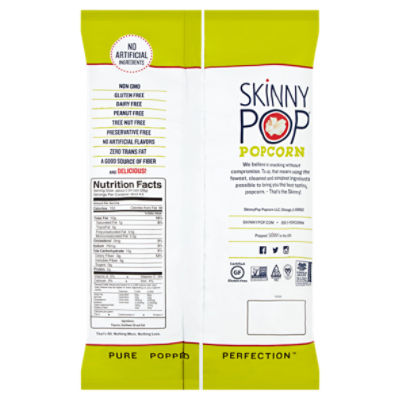 Skinny girl popcorn nutrition facts. Original Popped Popcorn Popcorn - SkinnyPop 3.8 (2917) Write a review Guilt-free snacking never tasted this delicious. NO ARTIFICIAL INGREDIENTS NON GMO GLUTEN FREE DAIRY FREE PEANUT FREE TREE NUT FREE PRESERVATIVE FREE NO ARTIFICIAL FLAVORS ZERO TRANS FAT A GOOD SOURCE OF FIBER AND DELICIOUS! Ingredients: Popcorn, sunflower oil and salt. ★★★★★ ★★★★★ 3.8 2917 Reviews Calories in Skinnygirl Salt & Lime Popcorn and Nutrition Facts - FatSecret Skinnygirl Salt & Lime Popcorn Nutrition Facts Serving Size 1 bag (6 cups popped) (42.5 g) Amount Per Serving Calories 160 % Daily Values* Total Fat 6.00g 8% Saturated Fat 2.500g 13% Trans Fat 0.000g Polyunsaturated Fat 1.000g Monounsaturated Fat 1.500g Cholesterol 0mg 0% Sodium 400mg 17% Total Carbohydrate 28.00g 10% Dietary Fiber 4.0g 14% Sugars Skinnygirl Popcorn- A Lighter Twist | The Nutritionist Reviews One cup of the popcorn has only 25 calories which is quite low. Skinnygirl popcorn has about 20% less calories than other brands of popcorn making it a great low-calorie snack. What I really like about this popcorn is that it can easily be eaten on the go. Calories in Skinny Pop Popcorn and Nutrition Facts - FatSecret Skinny Pop Popcorn Nutrition Facts Serving Size 1 cup (8 g) Amount Per Serving Calories 39 % Daily Values* Total Fat 2.32g 3% Saturated Fat 0.200g 1% Trans Fat 0.000g Polyunsaturated Fat 0.000g Monounsaturated Fat 0.000g Cholesterol 0mg 0% Sodium 12mg 1% Total Carbohydrate 3.50g 1% Dietary Fiber 0.8g 3% Sugars 0.00g Protein 0.78g Vitamin D -