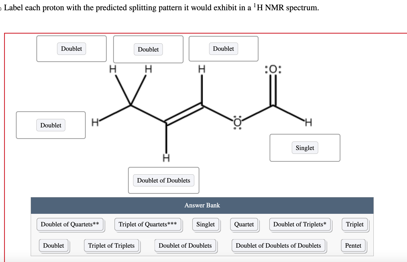 Solved Label each proton with the predicted splitting - Chegg Label each proton with the predicted splitting pattern it would exhibit in a 1H NMR spectrum. This problem has been solved! You'll get a detailed solution from a subject matter expert that helps you learn core concepts. Solved Label each proton with the predicted splitting - Chegg Label each proton with the predicted splitting pattern it would exhibit in a 1H NMR spectrum. * Doublet of Triplets or Triplet of Doublets ** Doublet of Quartets or Quartet of Doublets *** Triplet of Quartets or Quartet of Triplets This problem has been solved! Label each proton with the predicted splitting pattern it ... Label each proton with the predicted splitting pattern it would exhibit in a 1H NMR spectrum Either - YouTube 🚀To book a personalized 1-on-1 tutoring session:👉Janine The...