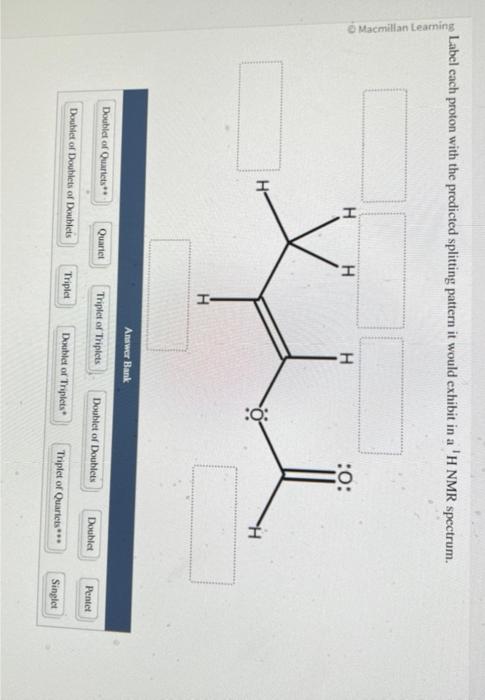 Solved Label each proton with the predicted splitting - Chegg Expert Answer. 100% (2 ratings) Transcribed image text: Label each proton with the predicted splitting pattern it would exhibit in a H NMR spectrum. Singlet Doublet Triplet Quartet Quintet CH3. Solved Label each proton with the predicted splitting - Chegg Label each proton with the predicted splitting pattern it would exhibit in a 1H NMR spectrum. Either a Singlet, Doublet, Triplet, Quartet, or Multiplet. They can be used once, more than once, or none. This problem has been solved! You'll get a detailed solution from a subject matter expert that helps you learn core concepts. See Answer