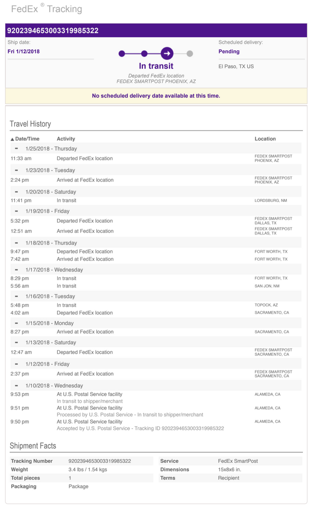 Fedex smartpost tracking. FedEx SmartPost: What Was It & Why Did It Change? | Reveel Mar 14, 2019 · FedEx SmartPost was a shipping service that utilized both FedEx’s ground shipping network and the U.S. Postal Service. In this hybrid model, shippers gave parcels to FedEx in whatever way they normally did. FedEx would then transport that shipment through its trucks, warehouses, and SmartPost specific sortation hubs. FedEx Ground Economy (formerly SmartPost) - ShipStation Help U.S. Apr 25, 2023 · The FedEx tracking number in ShipStation will provide tracking from pickup to delivery of Ground Economy shipments, even if the last mile delivery is handled by a different carrier. FedEx Ground Economy labels only support Label Message 1 , and it will appear as both text and a barcode. FedEx Tracking - Parcels Track FedEx Smartpost Return by using our tracking service at parcelsapp.com or in our iOS/Android apps. Locate FedEx Smartpost Returns tracking number (it's usually all digits like 02394653084833154920), enter it into package search field above and click Track Package. USPS.com® - USPS Tracking® USPS.com® - USPS Tracking®
